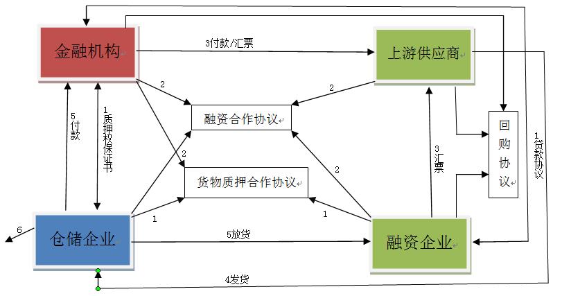 1.融資企業和金融機構簽訂《貸款協議》,倉儲企業和金融機構簽訂不可撤銷的協助行使質押權保證書。金融機構、倉儲公司和融資企業三方簽訂《貨物質押合作協議》。在這個過程中要求融資企業提供稅務登記證,營業執照,銀行賬戶資料,最近三到五年的經過審計的資產負債表,利潤表和現金流量表,以及會計報表輔助等。融資企業與上游供應商簽訂購銷合同。